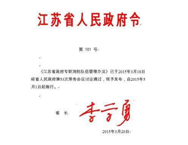 近日,江蘇省省長李學勇主持召開省政府第53次常務會議,審議通過了《政府專職消防隊伍管理辦法》(以下簡稱《辦法》)。自2015年5月1日起正式施行。
